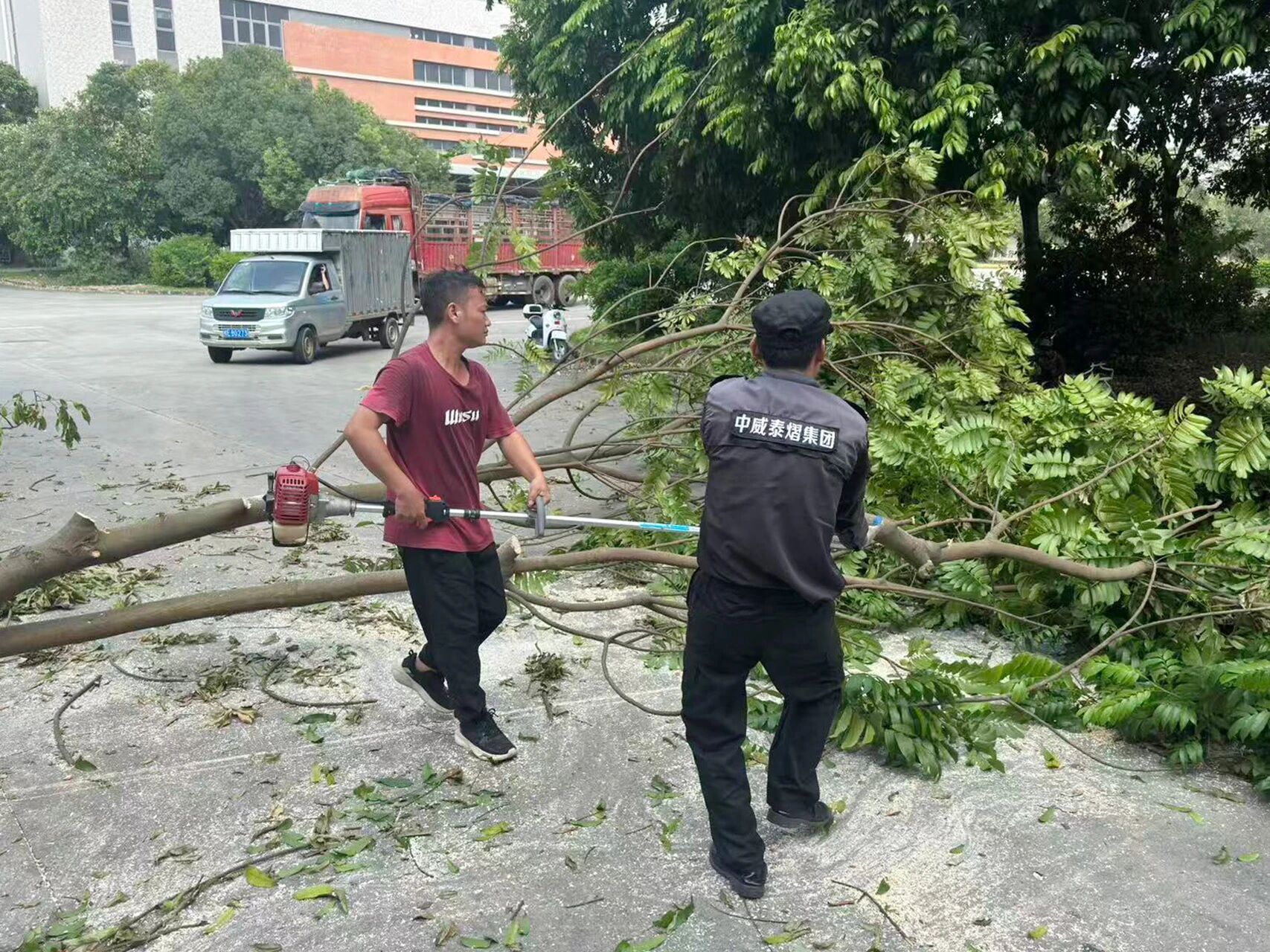 中威泰熠保安集团的工作人员便闻“风”而动,第一时间奔赴受灾现场。面对沉重的断木,他们默契协作、合力搬运,将一根根残枝断树稳妥装载至卡车,为后续清理运输打通通道;面对散落的残枝败叶,他们细致清扫,一点点清除路面障碍,让道路逐步恢复畅通;同时,他们还专注修复受损的围栏与交通标识,反复检查、仔细校准,力求尽快恢复公共设施功能,让区域秩序一步步回到正轨。