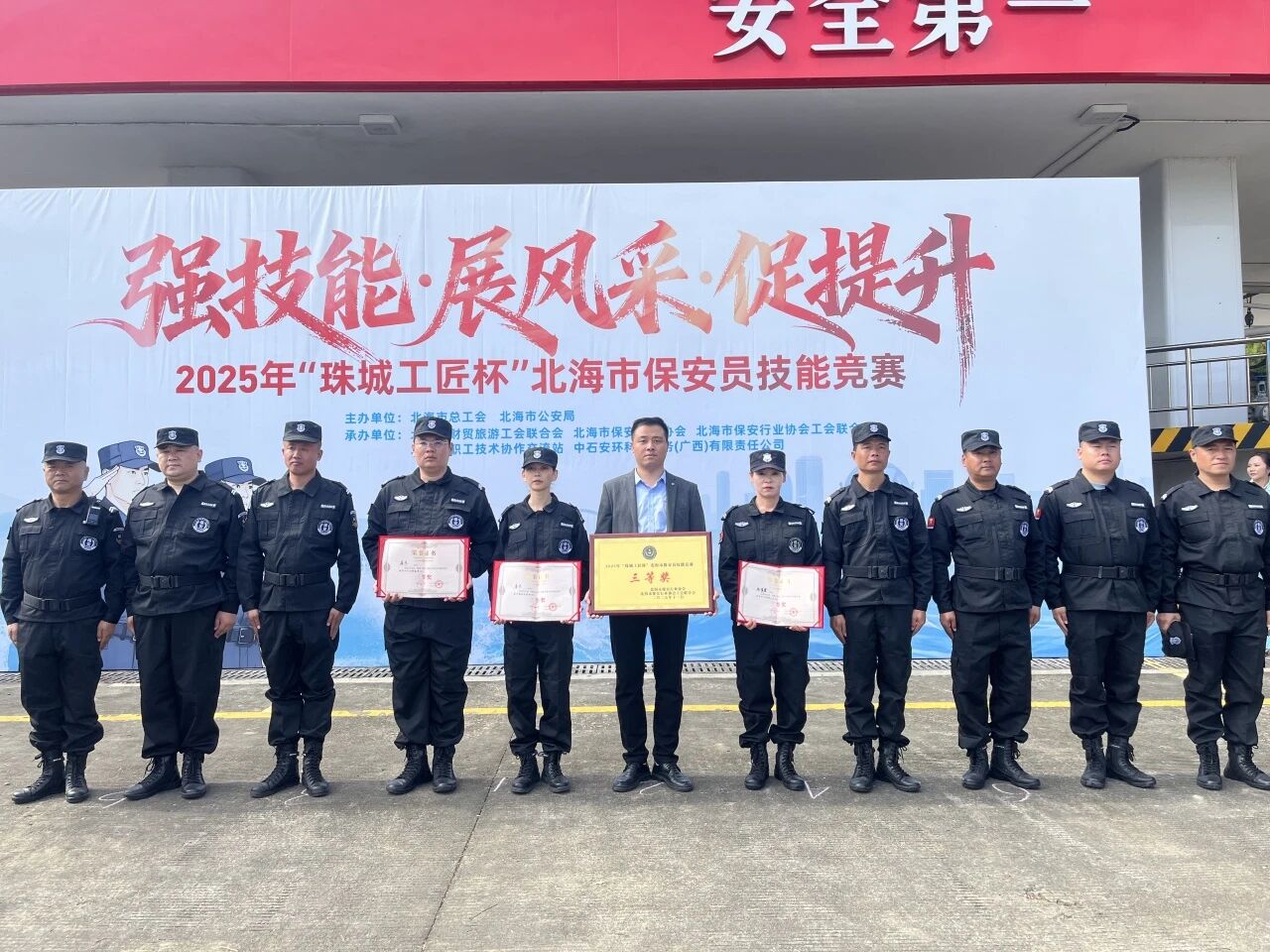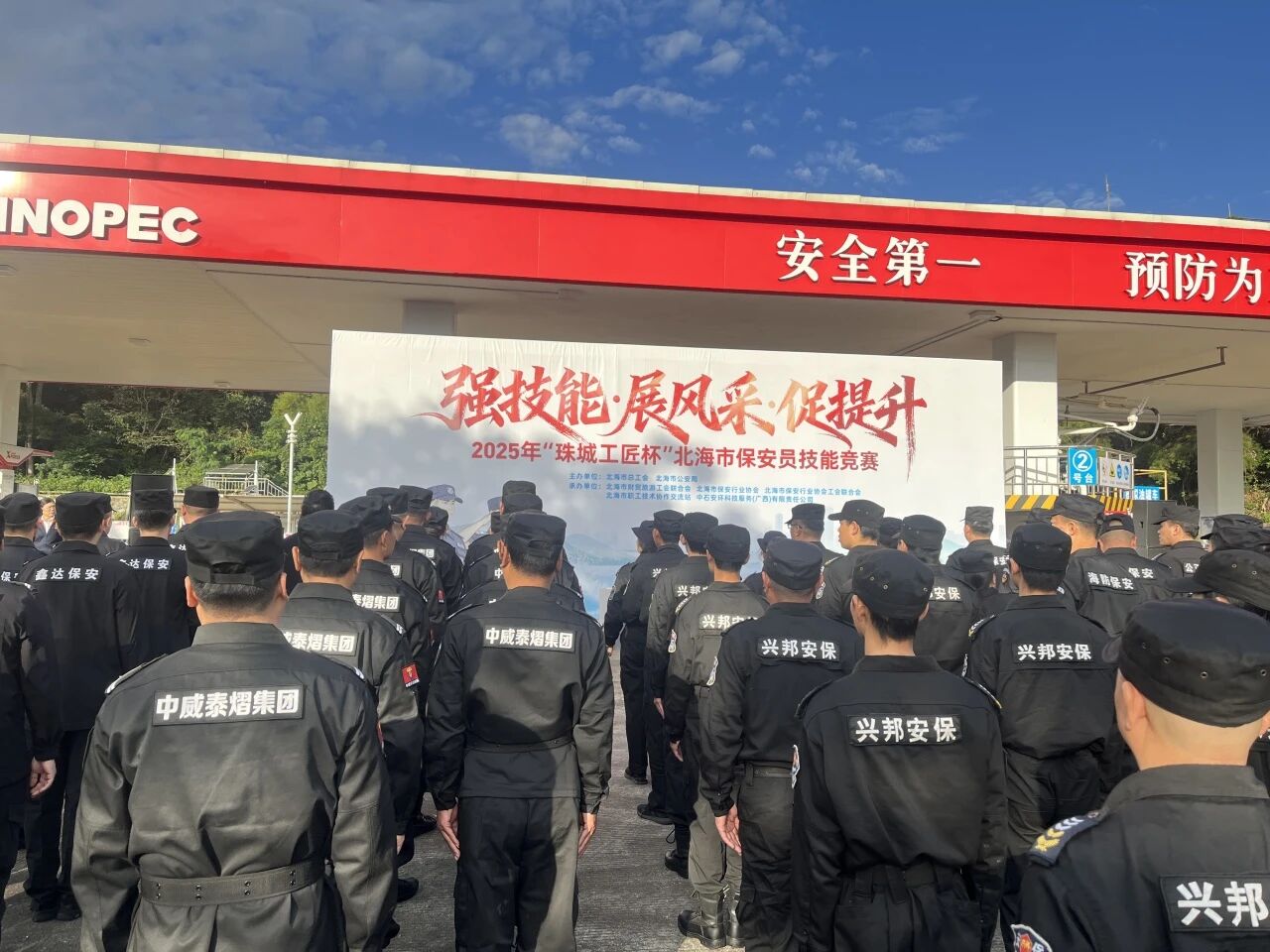 为提升保安队伍专业素养,激发从业人员奋进活力,由北海市公安局、北海市总工会主办,市财贸旅游工会联合会、北海市保安行业协会工会联合会承办的 “强技能・展风采・促提升”2025 年北海市保安员技能竞赛,于 11 月 22 日在中石安环科技服务(广西)有限责任公司圆满落幕。中威泰熠保安集团组织队员积极参赛,在各项比拼中交流成长、拼搏收获,充分展现了队伍的专业素养与奋进姿态。